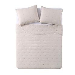 BOURINA Embroidery Quilt Set 3-Piece Oversized King Quilt Set Pre-Washed Microfiber Ultra Soft Lightweight Star Embroidery Bedspread Coverlet Set, Beige