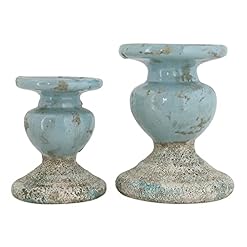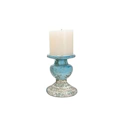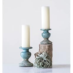 This beautiful pillar candle holder has a distressed blue glazed top with a cement textured base. It is beautiful enough that it can be placed in the room as decor by itself or used with a pillar candle on top.
