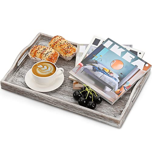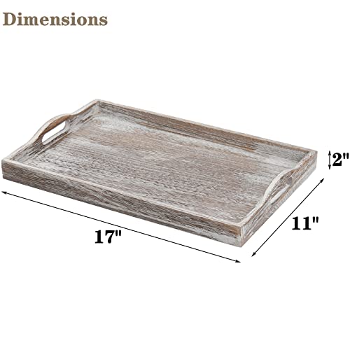 DEAYOU 2 Pack Rustic Wood Serving Tray, 17″ Ottoman Wooden Tray for Coffee Table, Farmhouse Vintage Decorative Tray Platter with Cutout Handle for Eating, Breakfast, Rectangle, 17″ L x 11″ W