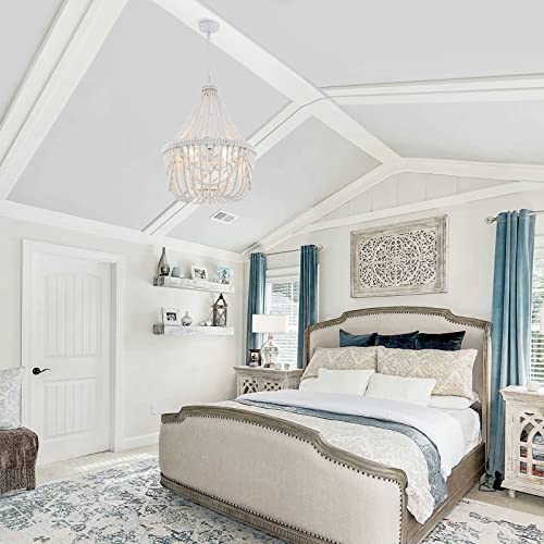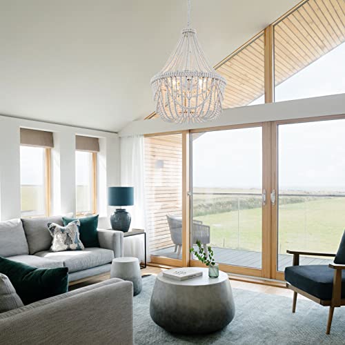 ELYCCUPA 20” Bohemia Large Wood Beaded Chandelier Coastal French Country Chandelier Farmhouse Antique Pendant Light for Living Room Kitchen Island Dining Bedroom, Distressed White, UL Listed