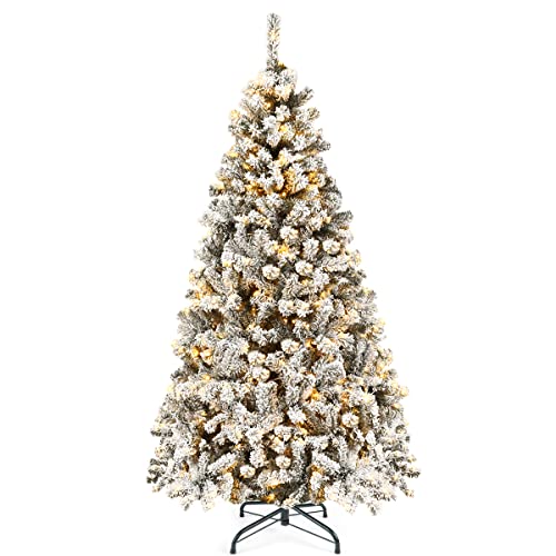 Goplus 6ft Pre-Lit Artificial Christmas Tree, Premium PVC Snow Flocked Hinged Pine Tree with Metal Stand and LED Lights, Perfect Xmas Decoration for Indoor and Outdoor