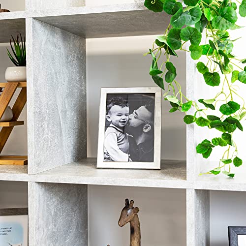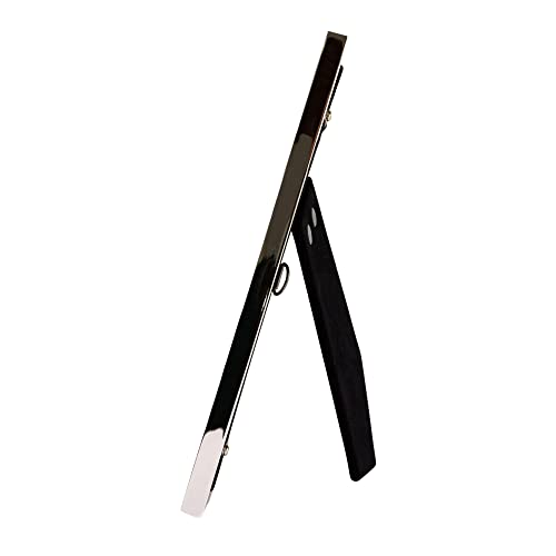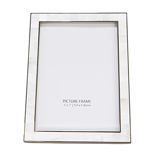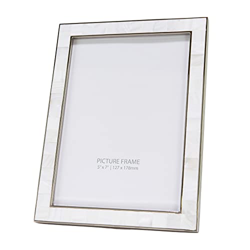 Contemporary and stylish top quality rectangular polished nickel plated metal picture frame with surrounding border of mother of pearl ivory squares. This picture frame would make a ravishing gift for any occasion or for use in the house or any business setting. This model can handiest be used free standing in either portrait or landscape. Please note that this frame may also be wall hung the usage of the D-ring clips hooked up. This classic straight edged picture frame holds a single 5″ x 7″ photograph. Lacquer coated and tarnish resistant. Complete with luxury black velvet backing and clear glass front.