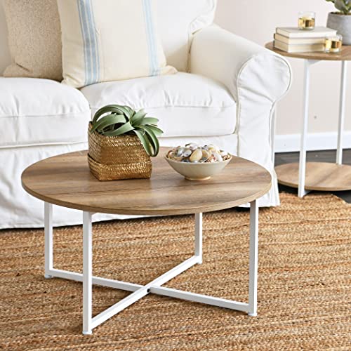 This round coffee table adds the easiest amount of modern minimalist design to any space. The large, round tabletop reaches nearly 32” in diameter, providing ample space for decor, storage, and more. The table has a stylish steel frame that crosses at the midpoint underneath the table for added stability and a chic look. The mix of materials and design give it a modern industrial feel, and the open frame keeps spaces taking a look light and airy compared to clunkier coffee tables. With a neutral color scheme and simple design, this table can mesh with a number of decor styles. The table’s low, round profile makes it ideal for a coffee table, but it may be used in other ways as well. Use it as a large end or corner table, or elsewhere in the lounge or other common areas. Its round shape means there are no sharp corners to catch on. The tabletop is made of high-quality engineered wood with a faux distressed woodgrain laminate finish. The engineered wood allows the table to be lightweight, and the laminate achieves the look of natural wood, but in a material that may be much easier to deal with. To clean the tabletop, simply wipe with a damp cloth, the usage of a mild cleanser if necessary. The table comes ready to assemble and is easy to put together. This table coordinates with other pieces in the Household Essentials Coastal Oak collection. One-year warranty included.