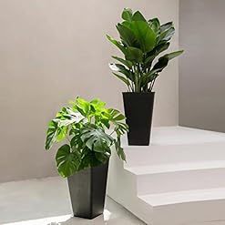 LARGE TALL PLANTER – This spacious indoor&out of doors set of 2 planters provide you with extra creative freedom for your different gardening needs. Your ferns, pothos, ivy, fiddle, or ficus tree will thrive in these large planters. Size:12”(Upper D) x 20”(H). Soil Capacity: 7 gallons per planter. (Plants don’t seem to be included)