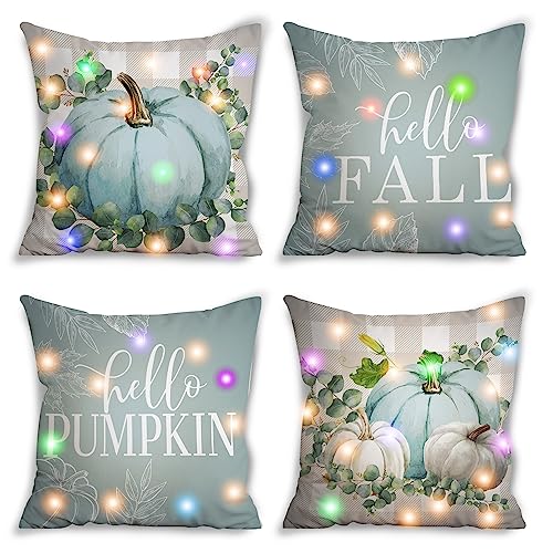 Thanksgiving Decorations Lighted Blue Pumpkin Thanksgiving Fall Pillow Covers 18×18, LED Blue Fall Decor Light up, Farmhouse Decorative Pillow Cover Set 4, Home Decor for Indoor Couch (Aqua/Teal)
