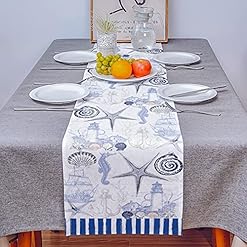Linen Burlap Dining Table Runner Dresser Scarves Seashells Starfish Lighthouse Seahorse Ocean Coastal Vintage Blue Texture Table Runners for Family, Farm, Party, Table Decor-