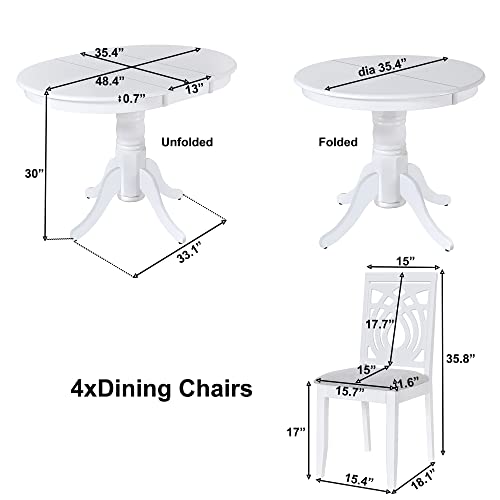 Merax Mid-Century Wood 5-Piece Extendable Dining Table Set with 4 Upholstered Chairs for Small Places, White_Round