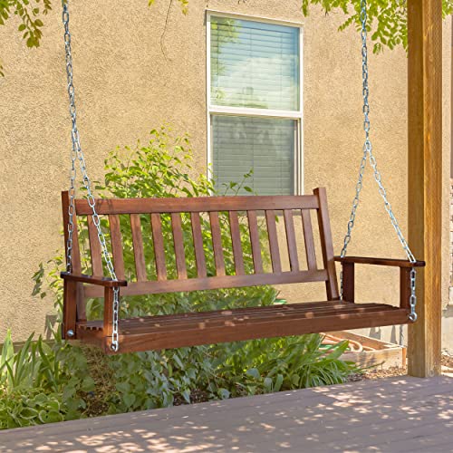 MUPATER Outdoor Patio Hanging Wooden Porch Swing 5FT with Chains, 3-Person Heavy Duty Swing Bench for Garden and Backyard, Wood Brown
