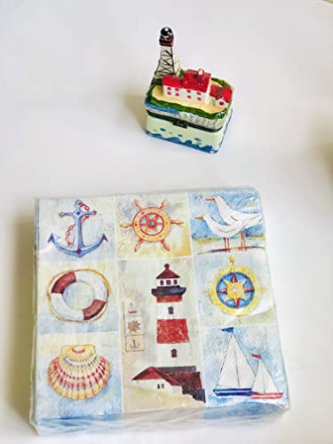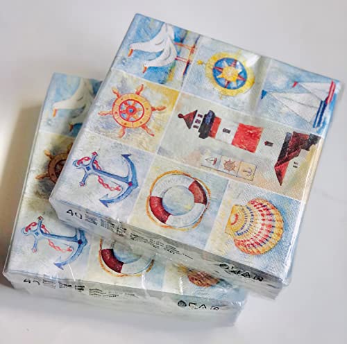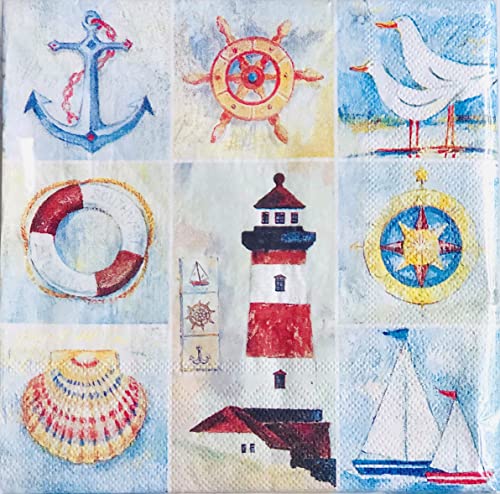 Nantucket Coastal Nautical Paper Napkins | Decorative Summer Fathers Day Fall Cocktail Beach Napkins, Blue, Red, Yellow, White, 6.5”x6.5”folded, 13”x13”unfolded