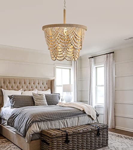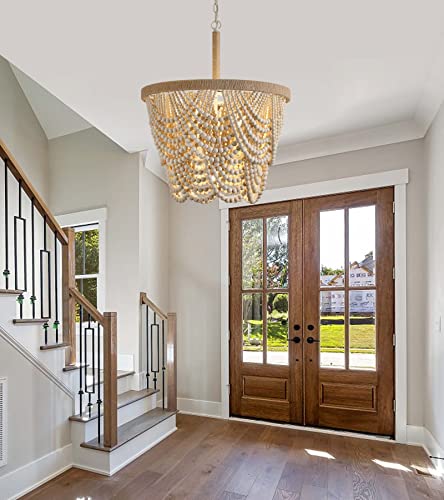 Q&S Boho Wood Beaded Chandelier,Farmhouse Coastal Large Bohemia 5 Lights for Dining Room Kitchen Living Room Entryway Foyer Hotel W19.9 UL Listed