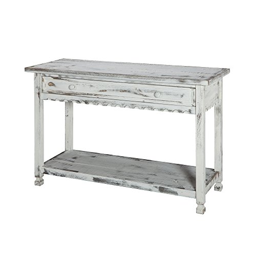 Distressed finish console table offers farmhouse style and functional design; dental work and square, turned legs be offering cottage style