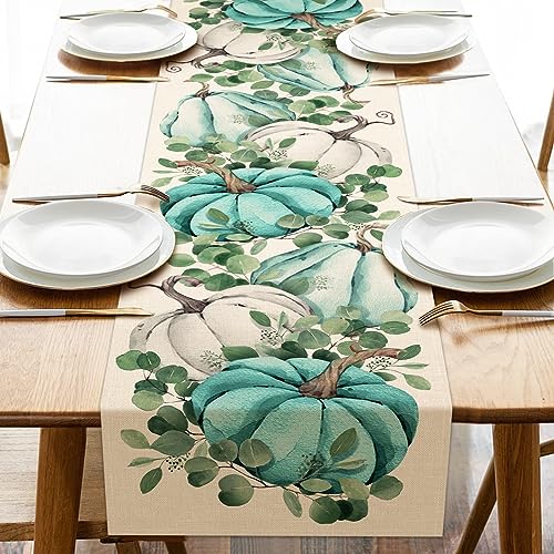 Seliem Fall Pumpkin Eucalyptus Leaves Table Runner, Thanksgiving Watercolor Blue Teal Scarf Home Kitchen Decor, Autumn Farmhouse Rustic Burlap Dining Decoration Indoor Outdoor Party Supply 13×90 Inch