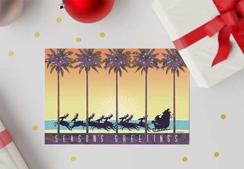 Tropical heat weather design theme Christmas card. Amount: 18 beach Christmas cards and white envelopes. Within Card: Wishing you a bright and lovely vacation season Size: 5×7 folded cards. Shiny finish on front and matte interior