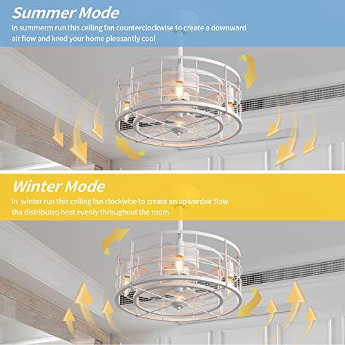 SYXLCYGJ Caged Ceiling Fans with Lights Remote Control, Enclosed Ceiling Fan Lighting Kits with Reversible 3 Speeds Motor, 4xE12 Bulb Bases Includes 2 Downrods, 20″ White