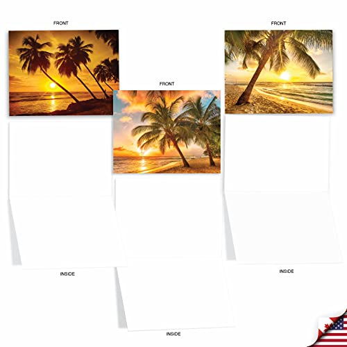 10 BLANK NOTE CARDS – Inside text is blank with no greeting. If you’re looking for a stunning assortment of tropical and soothing cards perfect for all occasions, then look no further! These beautiful photographs feature palm tree silhouettes against soothing orange sunsets. Sail away to the relaxing tropics at first glance. Customize your personal message. Ships with envelopes and reusable box.