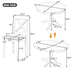 Dining Table Set Overall Dimension: Round table dimensions: 42″ D x 30.4″ H; Oval table dimensions:54″L x 42″W x 30.4″ H; Chair dimensions: 15.7″L x 17.5″W x 35.8″H. Full of country-chic charm, this beautifully distressed set makes a stylish observation. The lovingly worn finish matches perfectly with up to date, farmhouse or coastal chic decor.