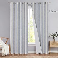 100% Blackout: Composed of 75% Polyeset & 25% Rayon fabric with beige/ivory vertical stripe print and 240gsm thermal treatment liner will block 100% sunlight out, provide you ideal sleep ambience.